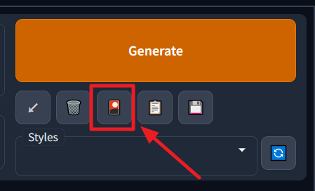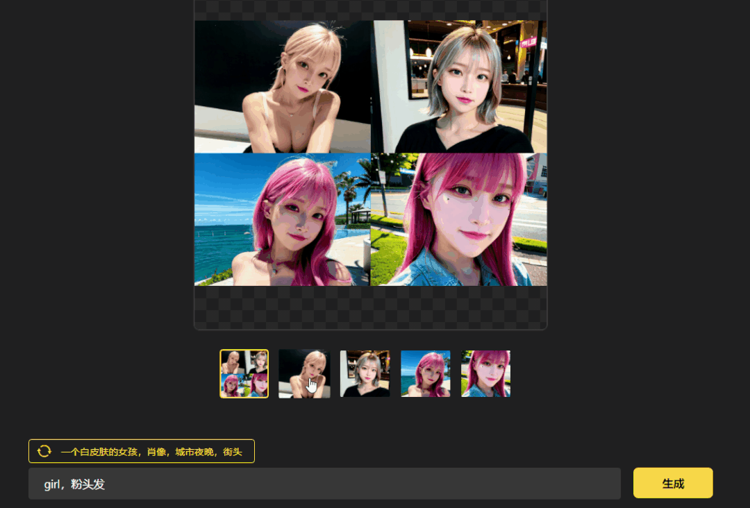 而在输入框的右侧,除了生成按钮,下面还有一行的快捷操作,分别为快速调用上一次生成的提示词,清除提示词,调用模型,应用保存好的提示词,保存当前提示词。