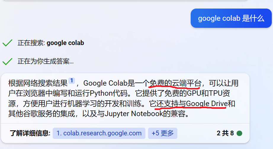 那 Google Colab 是什么?我们不妨来问问 bing:一句话总结,免费的云端平台。