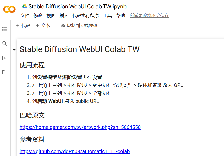 说实话,网上部署 Colab 的脚本有不少,我这里用的脚本是出自「巴哈姆特」论坛,一位台湾网友分享的脚本。