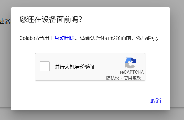 这个过程,以及后面把玩的过程,Google Colab 都会时不时的弹出人机验证。
