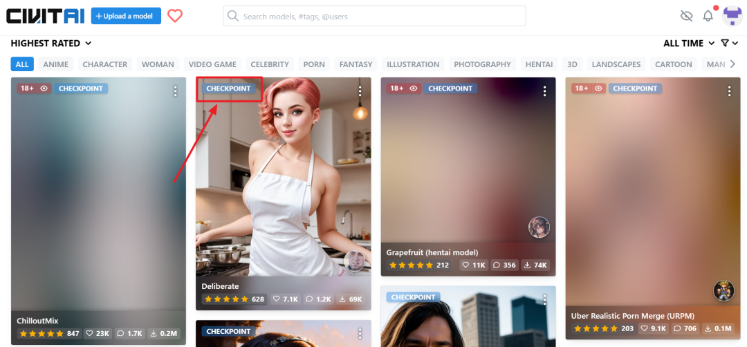 在 C 站上,模型展示处不是有「CheckPoint」的标签嘛,这个标签代表的就是大模型,而非补丁。