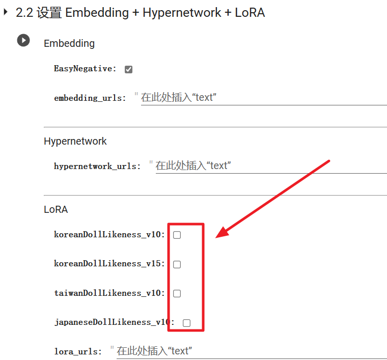 所以记得勾选这几个已经在 C 站上面下架的 LoRa 模型,韩风、台风、日风的小姐姐,其他的默认即可。