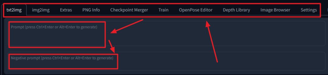 默认的主界面「txt2img」是文字生成图片的意思,第一个输入框是正向提示词,第二个输入框则是反向提示词。
