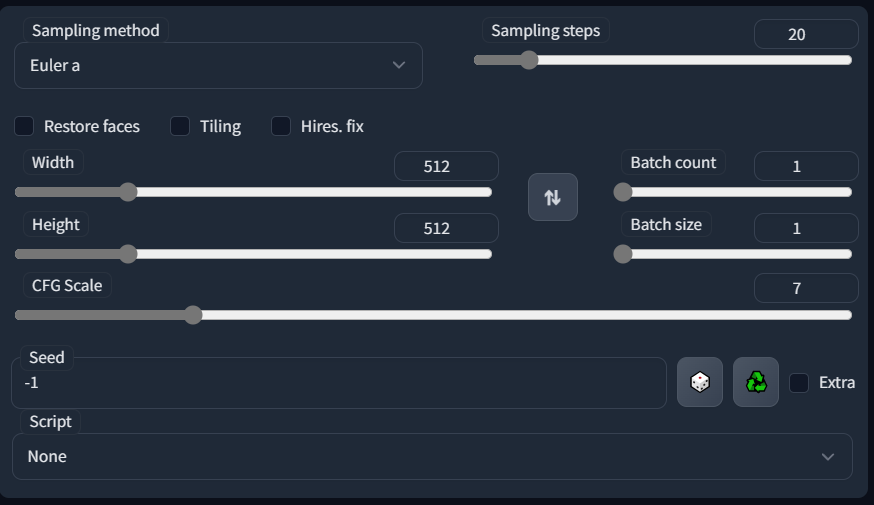 大致能用上的几个功能放这里,比如步数能让图片更精致,与提示词匹配程度能让 AI 更听话,随机种子是当前图片的唯一标识等等。