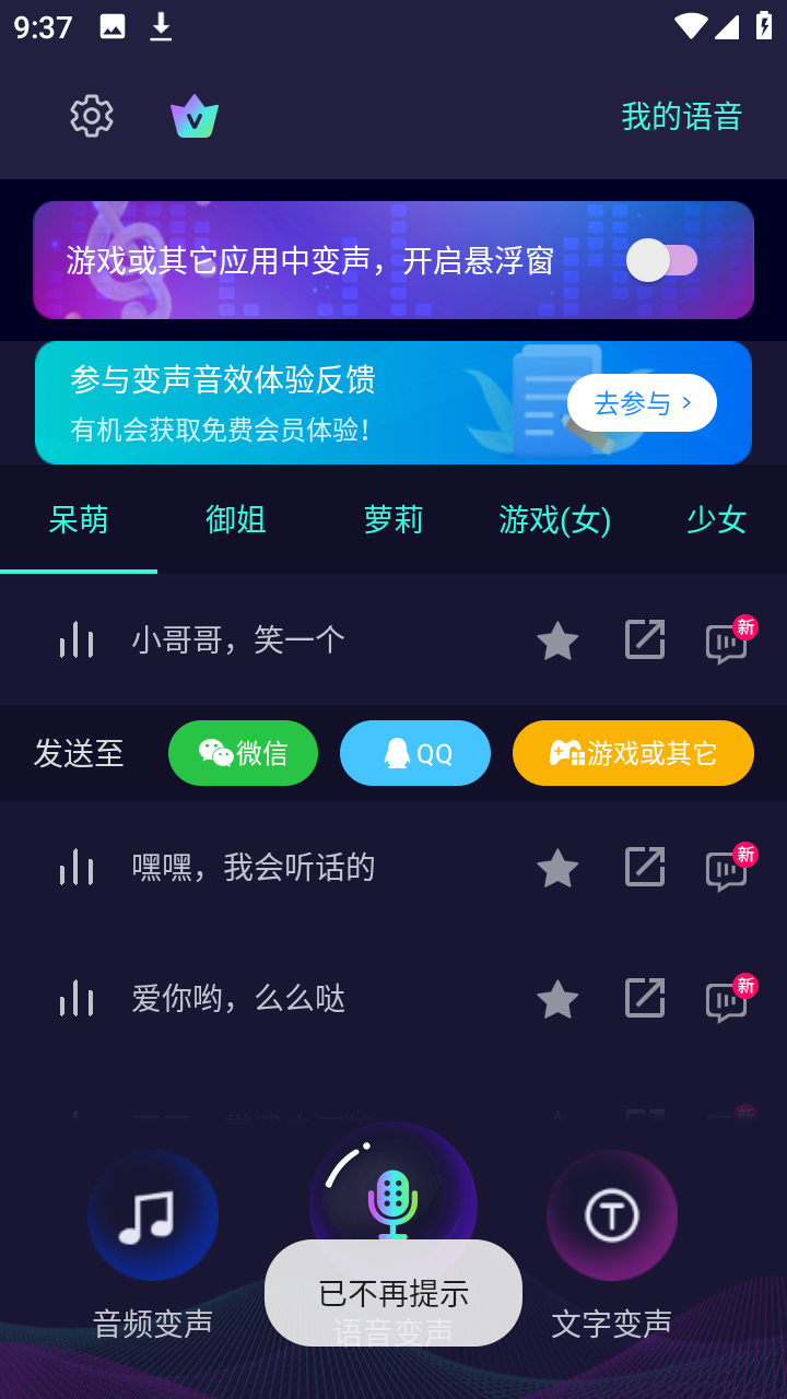 一款不错的变声器软件,有正常小姐姐声音、御姐音、萝莉音等。 有可能陪你打游戏的小姐姐是个抠脚大哥哥。 应用截图 Previous Next 急速下载 Get it!Download × 版权说明 翻应用是一个非营利性个人博客,并不贩卖软件,不存在任何商业目的及用途。不得将上述内容用于商业或者非法用途,本站信息来自网络,版权争议与本站无关。如有侵权请邮件与本站联系处理。 关注公众号不迷路!