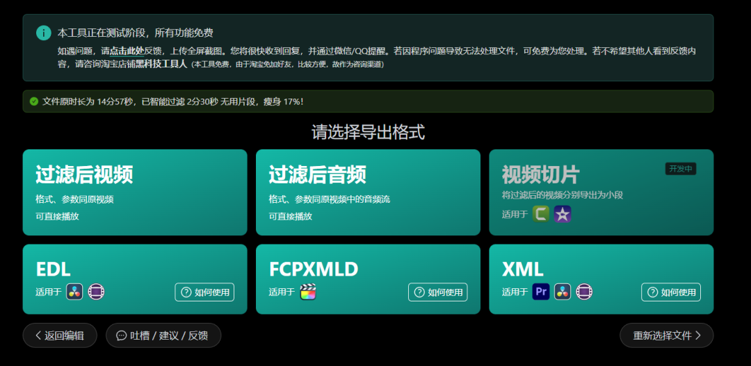 点击过滤处理后,处理速度非常快捷,然后点击右下角进行导出,可以直接导出过滤后的视频。如果想更专业处理,还可以导出其它格式,比如 XML 在 PR 软件中进一步处理,也有对应教程,感兴趣网友可以去研究一下。