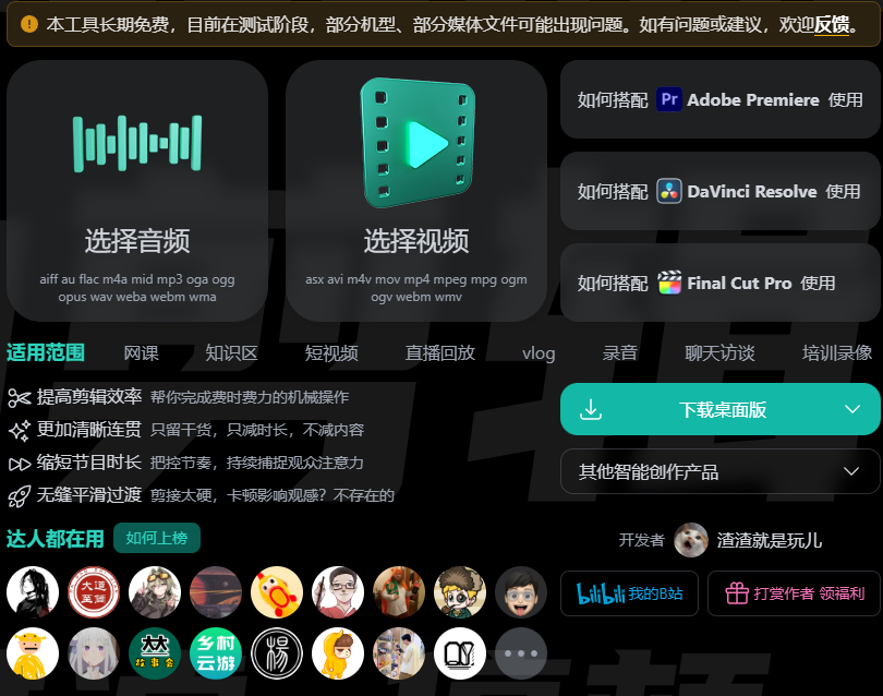 自动剪辑神器是一款自动剪辑工具,适用于网课,短视频,Vlog,直播回放,培训录像等类型视频,目前自动剪辑功能比较简单,适合视频的简单处理,对视频剪辑要求较高的可使用 PR 或者达芬奇等专业的剪辑软件。