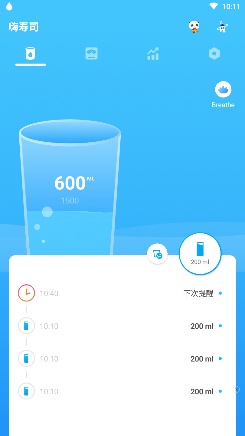 每喝一次水,我们就记录一次,「嗨寿司」还会计算出下次喝水时间并为我们设置提醒。
